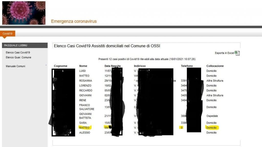Grande stupore per il sindaco Pasquale Lubinu nel ritrovarlo oggi nella lista. “Risulta nell’elenco dei casi di positività al Covid una persona di Ossi che è deceduta 12 anni fa. Il suo nome è Matteo, nacque a Ossi nel 1926 ed morì a Ossi nel 2008, ma compare nel database degli attuali positivi. Sarei veramente curioso di capire per quale assurdo giro quel nome è comparso dentro il portale dell’ATS”, commenta il primo cittadino.