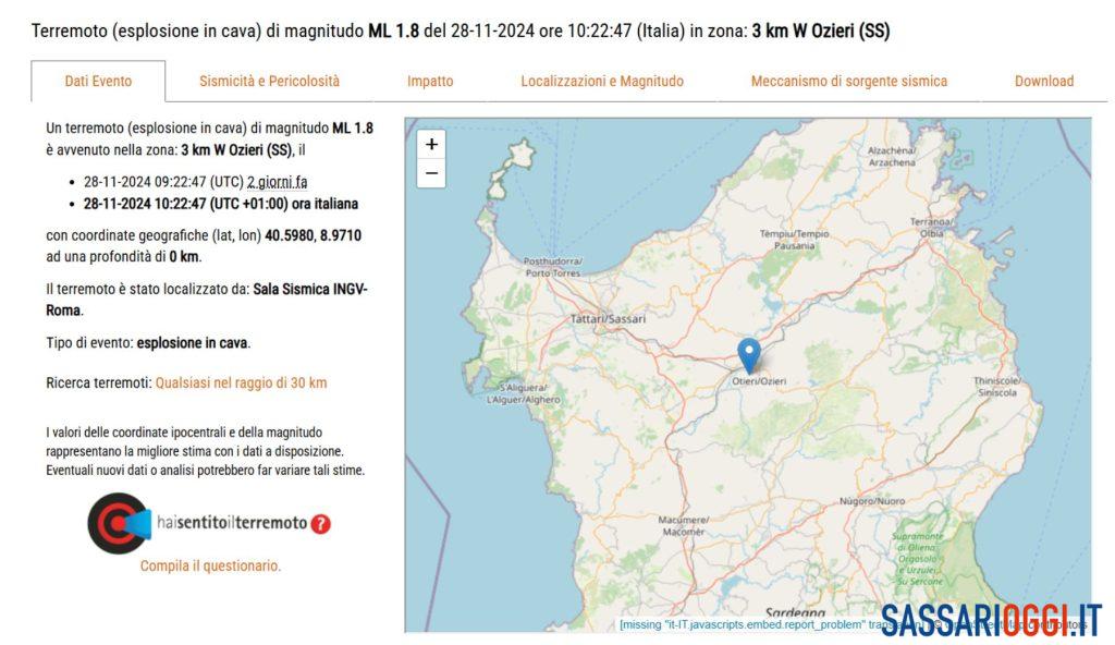 Giovedì scorso, i sismografi dell’Istituto Nazionale di Geofisica e Vulcanologia (Ingv) hanno registrato a Ozieri una leggera scossa di terremoto di magnitudo 1.8 sulla scala Richter. L’epicentro è stato localizzato a circa 3 chilometri di distanza, con una profondità stimata di poco meno di un chilometro.