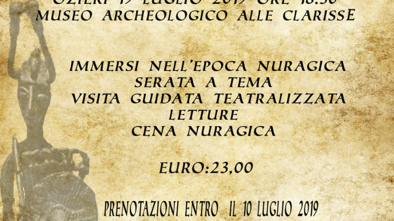 Venerdì 19 Luglio 2019 l’appuntamento è al Museo Civico Archeologico “Alle Clarisse” di Ozieri con la serata a tema “ A cena con la storia… Nuragica”, per immergersi nell’epoca del bronzo, quella degli antichi Nuragici.