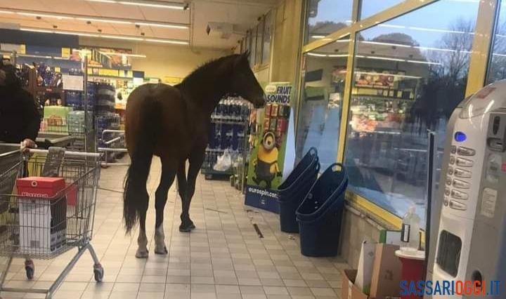 Sabato scorso, il cavallo aveva fatto “irruzione” all’interno del supermercato Eurospin di Ittiri. Grande era stato lo stupore fra i clienti, che lo avevano visto muoversi tra gli scaffali. Per nulla spaventato dalla presenza degli umani, dopo un breve giro, era passato davanti alla cassa ed era uscito.