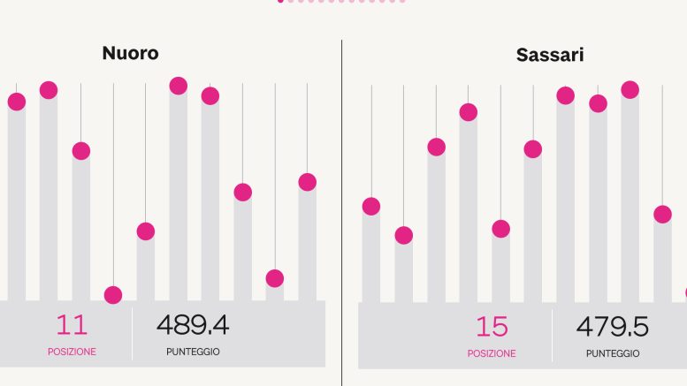 Male anche per l’occupazione dei giovani. Sassari è sedicesima su 107 province. Per quanto riguarda la qualità di vita dei più piccoli, Nuoro non è tra le città che offre di più, essendo 45esima. A fare peggio è Sassari, 63esima nella classifica. Uno dei tasti dolenti di Nuoro sono la carenza di posti negli asili nido, di cui è 73esima, le barriere architettoniche, 78esima. Mentre per Sassari (63esima) pesa molto la carenza di spazi all’aperto nelle scuole e di verde attrezzato (99 esima). A Nuoro i bambini sono poco sportivi, facendo slittare la città al 106esimo posto, mentre Sassari non può vantare una posizione virtuosa, 91esima su 107 province.