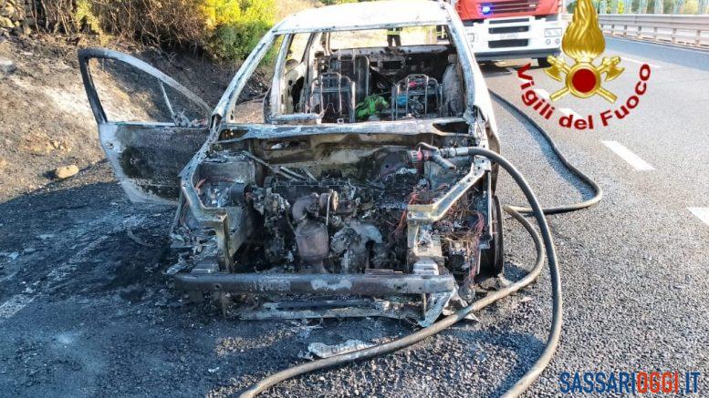 Auto in fiamme sulla strada statale 131.