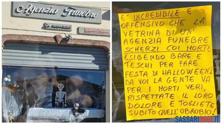 L’iniziativa è piaciuta ai più, ma qualcuno ha storto il naso davanti alla vetrina dell’agenzia funebre Alessio Orrù di San Sperate. Il titolare, da cui prende il nome l’omonima attività, ha deciso anzitempo di allestire una vetrina a tema Halloween, con tanto di bara, in cartone, e scheletro affacciato. In molti hanno trovato l’idea simpatica, tranne uno, che ha lasciato un biglietto indirizzato ad Orrù.