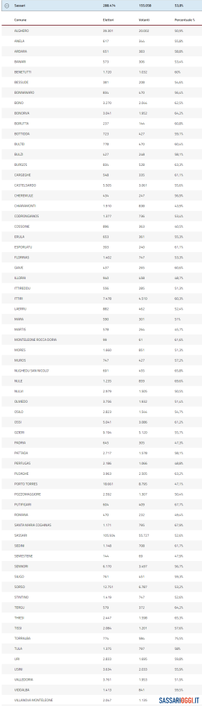 Alle Regionali, nelle 1.884 sezioni in Sardegna, hanno votato 758.252 elettori, l’affluenza definitiva è al 52,4%. Il dato complessivo di tutta la circoscrizione Sassari è di 155.058 votanti su 288.474, il 53,8%. In tutta la Sardegna il record spetta a Torralba (seguita da Buddusò) col 75,5%: su 774 elettori si sono presentati ai seggi in 584. Al secondo posto c’è Nule col 69,6%, terza Santa Maria Coghinas col 67.9%. La percentuale minima di votanti è stata a Cossoine (40,5%), Chiaramonti (43,9%) e Martis (45,7%). A Sassari città ha votato il 52,6% degli elettori mentre l’affluenza ad Alghero si è fermata al 50,9%. Alle 7 di mattina comincia lo spoglio.