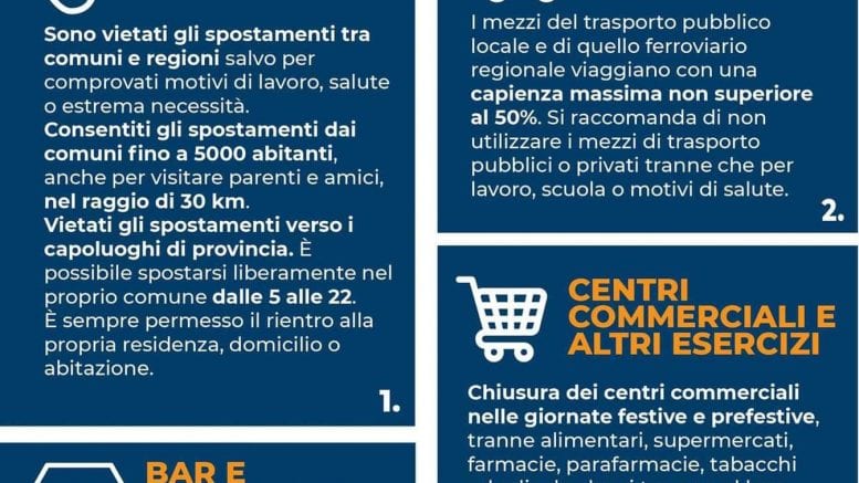 I bar e i ristoranti chiuderanno alle 18. Da quell’ora sarà consentito solamente l’asporto fino alle 22 e il domicilio senza limiti d’orario. Non sarà consentito, dopo le 18, consumare cibi o bevande all’esterno del locali.