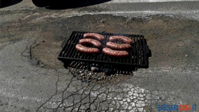 La situazione è stata denunciata con una buona dose di sarcasmo sul gruppo Facebook ”Segnala a Sassari“. Un cittadino, stanco di attendere un intervento che non arriva, ha condiviso un fotomontaggio con l’intelligenza artificiale che trasforma il cratere in un improvvisato barbecue urbano. Nell’immagine si vede una griglia carica di salsicce posizionata perfettamente sopra il buco, quasi a suggerire un uso alternativo per quella che è diventata a tutti gli effetti una minaccia per la pubblica incolumità.