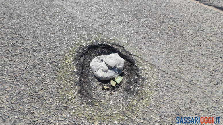 A Sassari qualcuno ha messo sacchi di spazzatura e pietre per coprire le buche. Un’iniziativa provocatoria o semplicemente maleducazione? Le foto sono state scattate in via Giuseppe De Martini da un cittadino che le ha postate sul gruppo “Segnala a Sassari”.