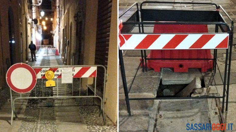 Forse una perdita idrica dietro il cedimento del basolato in via Turritana a Sassari