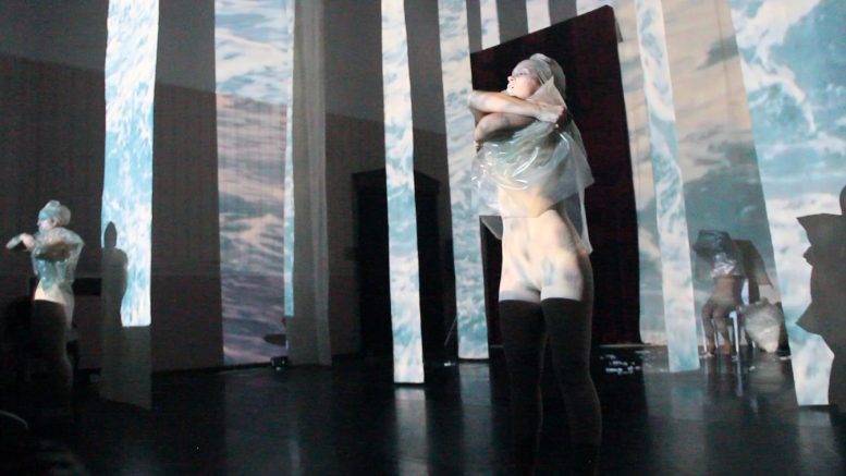 Oltre al portale d’accesso, il portamento e l’espressione quasi aliena di tre danzatrici. I loro corpi aggraziati e volteggianti, avvolti in tute color carne aderentissime, hanno lasciato intravedere una vibrante sensualità, semicelata all’interno di buste trasparenti indossate come costumi. Strofinati contro il corpo, gli involucri di plastica hanno prodotto una sorprendente ritmica di suoni perfettamente a tempo di musica.