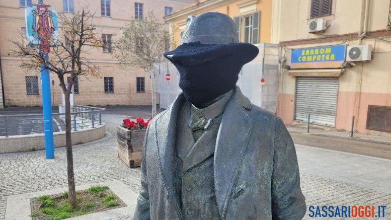 Dopo la mascherina il passamontagna. Qualcuno continua a preoccuparsi per l’abbigliamento della statua di Enrico Costa in piazza Fiume a Sassari. Da qualche giorno sul viso del monumento, in sostituzione della ffp2 precedente, è apparsa una copertura di lana che ha lasciato libero soltanto il cappello. Una forma di protezione estrema a metà tra il gesto provocatorio e l’ironia “cionfraiola”, marchio di fabbrica del popolo sassarese.