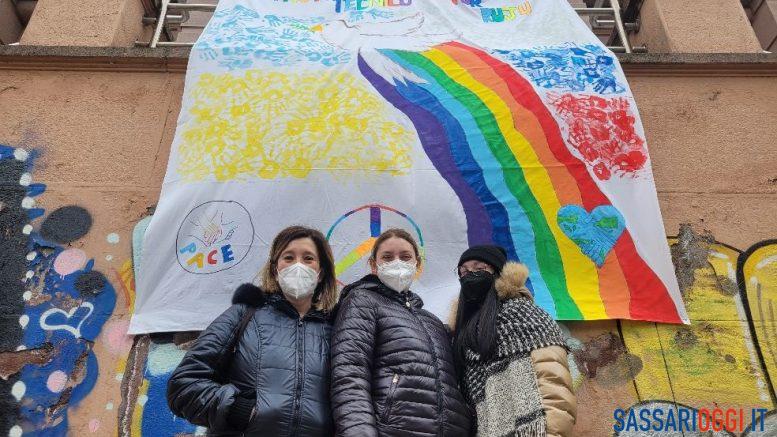 I ragazzi dell’Istituto Salvator Ruju di Sassari espongono un’opera per la pace davanti alla scuola.