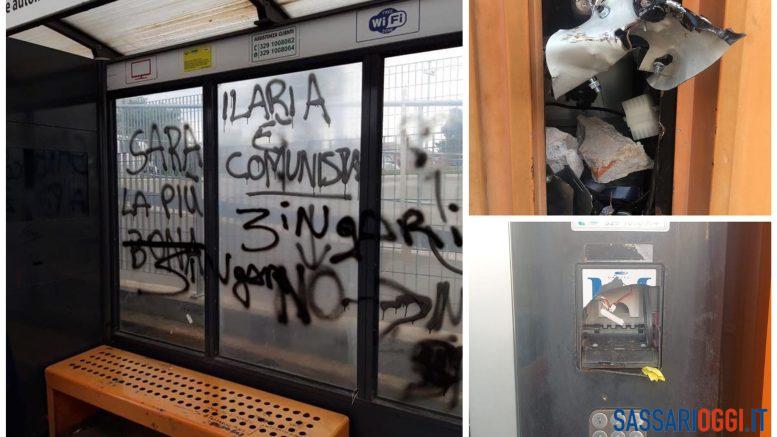 Scritte e danneggiamenti alle pensiline dell’Azienda Trasporti Pubblici di Sassari. Alcuni vandali hanno riempito di scritte la copertura laterale e distrutto buona parte dei distributori automatici h24.