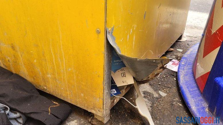 Indumenti sparsi per via Attilio Deffenu a Sassari. Lo denunciano due residenti di un palazzo storico che vivono la non invidiabile condizione di abitare al pianoterra a poco più di un metro dai cassonetti della spazzatura. “Ci sono tutti – racconta Nino, l’altro è Massimiliano – secco, plastica, umido, vetro”. A cui si affianca il contenitore per la raccolta di indumenti e materiali tessili, il classico “armadio giallo” dove si conferiscono anche, si legge nella spiegazione, “borse tende, biancheria, coperte, scarpe” da inserire in appositi sacchetti.
