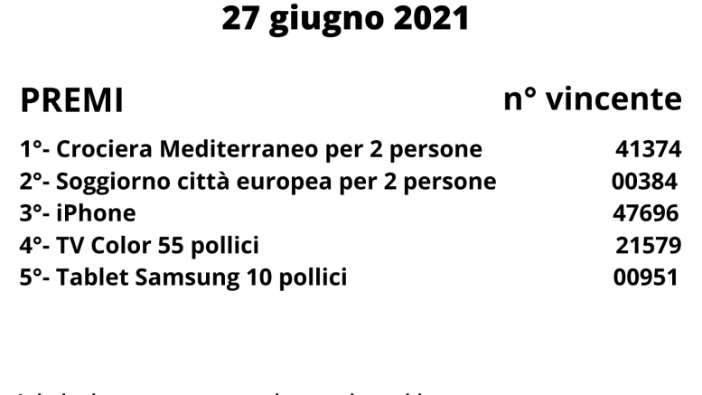 Il sorteggio dei biglietti della lotteria è avvenuto in assenza del pubblico nel rispetto delle norme anti-Covid. I premi saranno disponibili per il ritiro da parte degli aventi diritto per i successivi 30 giorni dall’estrazione.