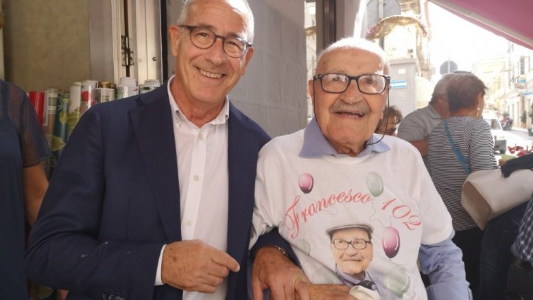 Lungo la strada si ferma a salutare e scambiare quattro chiacchiere con tutti i negozianti della zona. Francesco Viola, classe 1917, oggi ha festeggiato i suoi 102 anni in largo Brigata Sassari dove i suoi amici commercianti hanno organizzato per lui un rinfresco. Il sindaco Gian Vittorio Campus ha partecipato alla festa per portare gli auguri e una medaglia con i saluti della Città come dono della comunità.