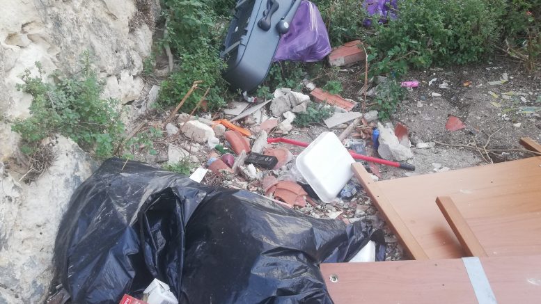 Tra le erbacce è spuntato un sedile portatile per neonato. Poco più avanti cartoni di pizza e gelato, plastiche di vario genere, bottiglie di detersivo, salvaslip, golfi, indumenti, siringhe e una ruota d’auto.