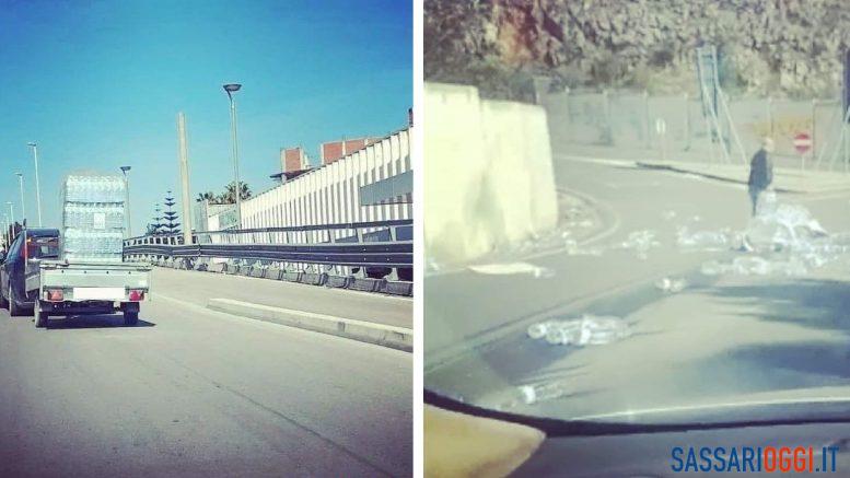 Casse d’acqua sparse sulla strada di Predda Niedda a Sassari. Sono divenute virali le foto che ritraggono un automobilista trascinare sul rimorchio un pianale di bottiglie d’acqua impilate una sull’altra. Una piramide assai traballante intravista a pochi metri dall’ingresso della Promocamera e impressa in una prima immagine che ne denunciava tutta la precarietà.