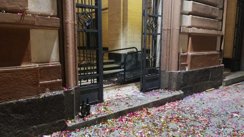 Abbandonati a terra i cannoni spara coriandoli con relativo contenuto davanti le entrate dell’ateneo. Ma anche bottiglie di alcolici, proprio sopra i gradini.