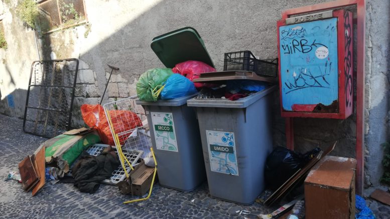 Stracolmi anche i cassoni che avrebbero dovuto contenere secco e umido. Al loro interno, la raccolta differenziata è diventata un optional visto che si trovano cassette in plastica, buste di rifiuti vari e contenitori di bevande.