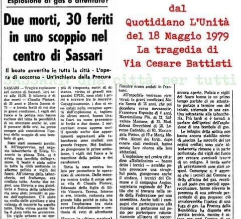 A Sassari in quel periodo il gas di città era da tempo in disuso. Dalle indagini si scoprì che a provocare l’immensa tragedia furono delle bolle di gas, formatesi nel sottosuolo. “È arrivato il momento – conclude Marcella – di onorare queste povere vittime, con una targa in loro memoria, da affiggere proprio in via Cesare Battisti, che è stata teatro di una così immane tragedia. Lo chiedono i cittadini, la nostra amministrazione ci deve ascoltare. Anche se sono passati 41 anni”.