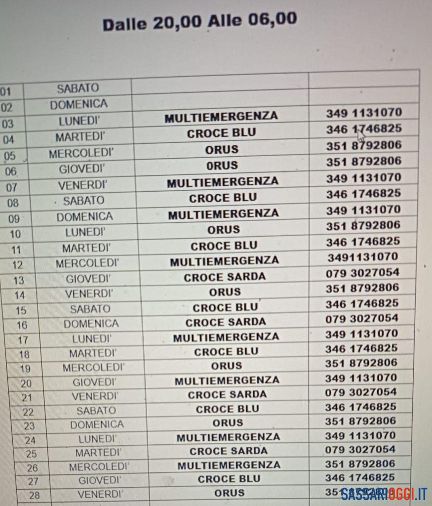 I recapiti delle associazioni sono: Croce Blu 346/1746825, Croce Sarda 079/3027054, Multiemergenza 349/1131070 e Orus 351/8792806.