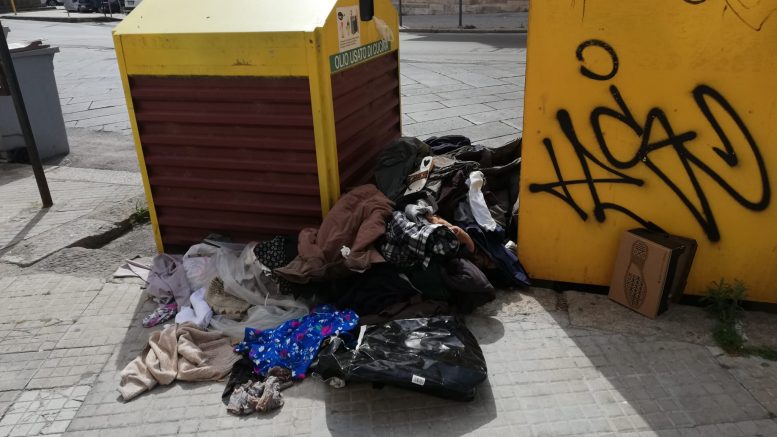 Numerosi capi di abbigliamento gettati a terra e sparsi tra via Saffi e via La Marmora a Sassari. Da alcuni giorni l’area, prospiciente la chiesa di Sant’Antonio Abate, è oggetto di attenzioni incivili da chi, nonostante la chiusura forzata dei cassoni, continua ad abbandonare abiti, vestiti e quant’altro.