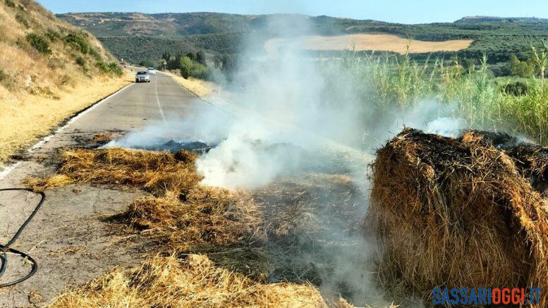 Attimi di paura, ieri, sulla strada per Sorso. All’altezza della provinciale 29, in località Liscia, per cause in fase di accertamento, due balloni di fieno hanno preso fuoco nel carrello di un’auto.