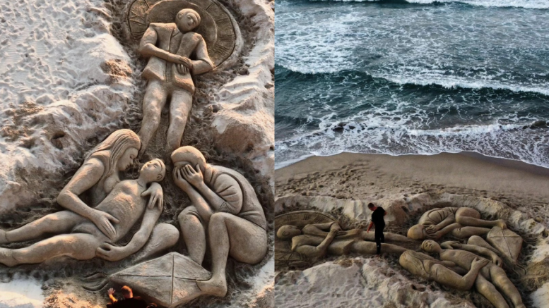 Questo è il messaggio che l’artista Nicola Urru ha voluto esprimere con la sua nuova scultura di sabbia sulla spiaggia sassarese di Platamona, un altorilievo di circa 15 metri. L’opera rappresenta il dolore dei genitori di Gioele, con una figura alle loro spalle che emerge dietro un grande orologio, simbolo del tempo che si ferma nel dolore. In basso, un aquilone: un toccante omaggio al momento in cui Gioele, giocando con un aquilone, è stato travolto dalla pesante porta. Urru è un artista che da tempo dà voce alla sabbia, attraverso le sue sculture che trattano temi di attualità e di riflessione.