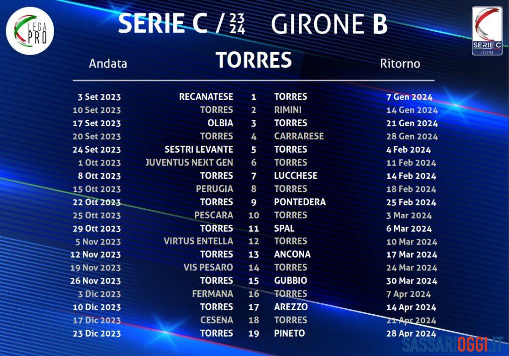 Il primo ottobre la Torres giocherà in trasferta contro la Juventus Next Gen e la sfida in casa con la seconda squadra dei bianconeri è in programma a Sassari il 4 febbraio. Il campionato dei rossoblù si chiuderà in Abruzzo: l’ultima partita della stagione regolare sarà il 28 aprile 2024 a Pineto.
